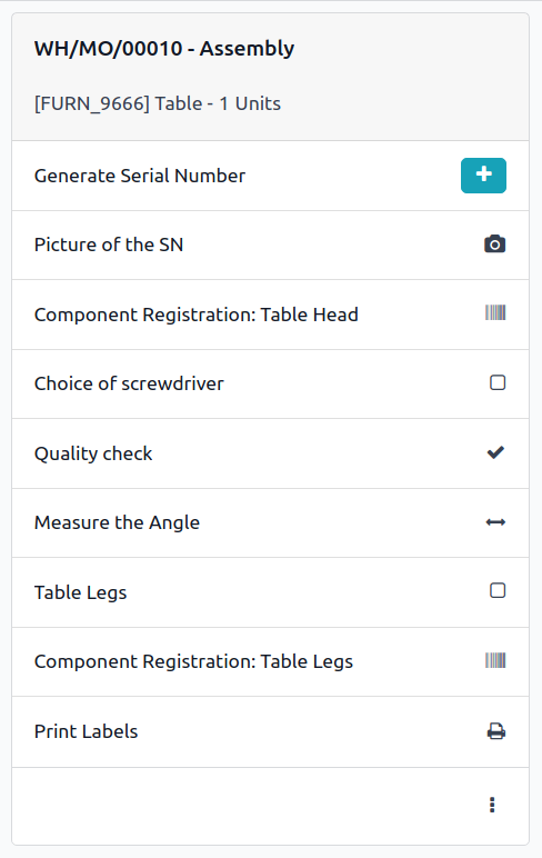 Rastrea componentes y fabrica en lotes o números de serie. Ve todas tus operaciones en un solo clic.